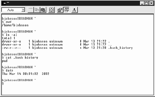 Скрипт cygwin.bat выполняется из командной строки DOS, устанавливает среду Cygwin и запускает интерпретатор bash под Windows. Cygwin прекрасно настраивает переменные Unix-окружения в соответствии с переменными окружения Windows. Например, на своей машине, я вошел в Windows, как пользователь bjohnson. Когда я запускаю Cygwin, он по умолчанию загружается под управлением пользователя bjohnson.