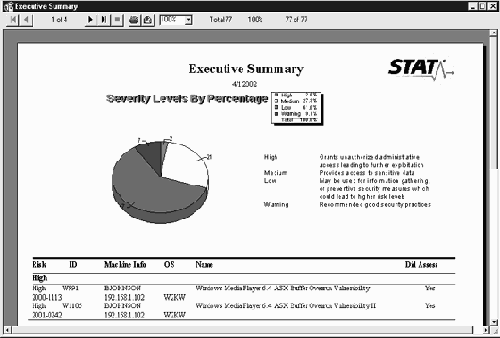 У STAT много форматов и параметров отчетов, доступных в меню Reports. Выберите формат, отметьте одно из проведенных сканирований, и STAT создаст отчет. На рис. 12.15 показан отчет Executive Summary.